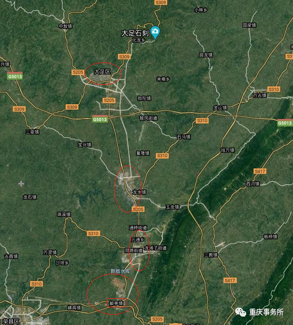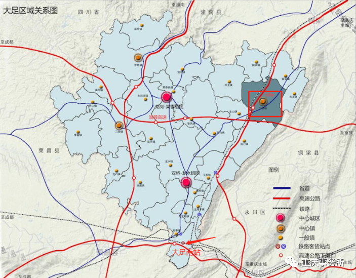 01大足其实已有一条高铁。2015年成渝客开通,设大足南站,位于邮亭镇。但是,这个高铁站离大足的城区实在太远了,约有30多公里,从这里坐公交回主城要花去约1个小时,所以对大足的意义非常有限。大足的城市是组团式结构。从地图可见,大足城市组团主要由龙岗-香棠组团、龙水-双桥组团构成,两组团之间相隔有10多公里,而龙水双桥组团中,龙水、双桥、邮亭也没有实现连片。因此,从邮亭的大足南站,到任一组团,都不便捷。当年在此设站,可能考虑的是推动双桥重型汽车基地的发展。