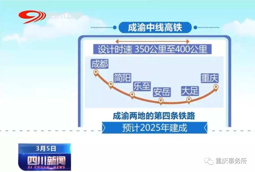 经大足北部的成渝中线高铁,是纳入《国家发展改革委关于成渝地区城际铁路建设规划(2015~2020年)的批复》线路。从2016年起,大足就不断提出加快成渝中线高铁的诉求。2017年成渝中线纳入重庆铁路网中长规划,规划是2030年开展前期工作。之后,不断提速。在2018年重庆推出的米字型高铁实现“五年全开工”计划中,成渝中线高铁(重庆西站至大足段)被纳入其中。今年随着川渝合作的深入,成渝中线高铁确定今年实现开工。