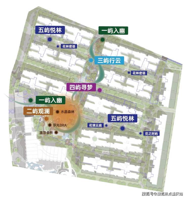 【景观打造】湾之屿园境美学,取江湾之形,置入园中,如一湾江水,在园中蔓延,与江湾的延伸带交相呼应;五大景观节点如小岛一般,坐落在江湾之中,五屿成轴,充满无限诗意。