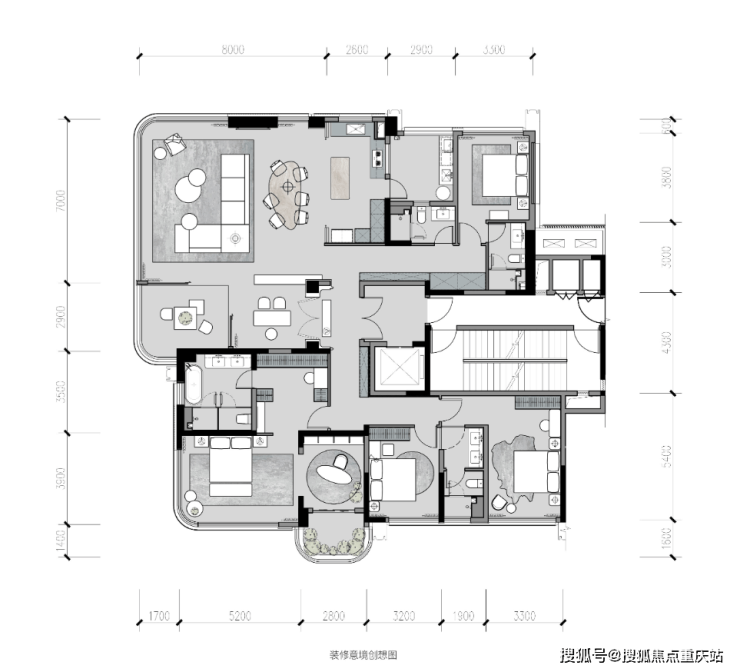 199㎡户型其设计核心是重点优化了隐私性与收纳功能。