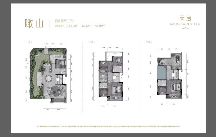 上叠:实得面积约200㎡,一层阔绰玄关轻松收纳,奢阔横厅多功能共享,老人独立房间,颐养天年。二层套房级主卧,双儿童房设计,双阔景露台,实用不失雅致。三层大露台,灵活多变,一览山居生活。