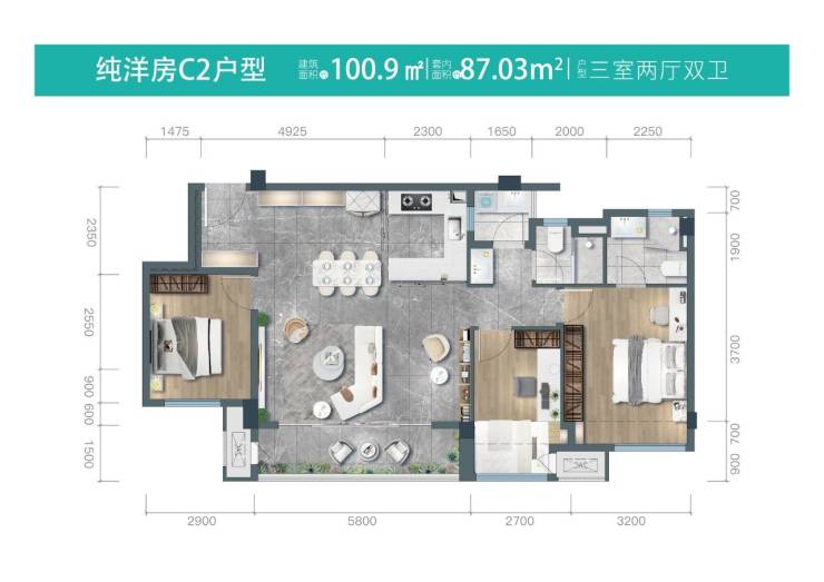 建面约100平套三