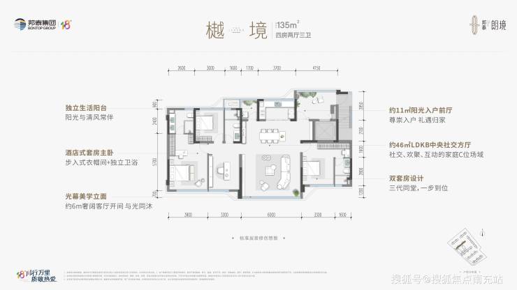 建面约135㎡ 樾境 四室两厅三卫+双套房(精装)光幕美学立面,酒店式套房主卧,双套房设计,中央社交方厅