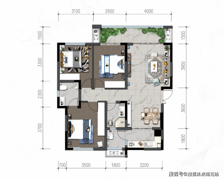 主人房和老人儿童房分隔有效解决不同生活习惯问题开敞形客厅,独立餐厅设计,4M开间的客厅展示面,佳独立餐厅区域