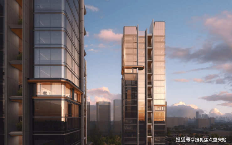 建筑立面设计采用高端定制材质,从用料上展现豪宅底蕴。主立面采用了蓝灰玻璃、浅色铝板、米色石材等材质,转角处均采用弧形设计,外立面挺拔大气不失柔和,既能融入周边环境,又在环境中脱颖而出,顶部钻石塔冠的设计也为外立面增加标识性和艺术美感。