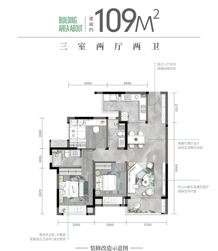 高层109㎡户型:拥有超宽楼间距,房间全朝南,可俯瞰公园美景,是备受期待的三房户型(待售:9号地块2、3号楼)。