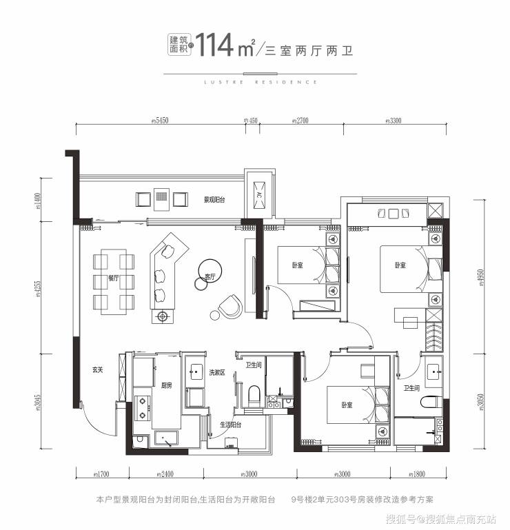 114平横厅套三双卫(总高26层,3梯6户)