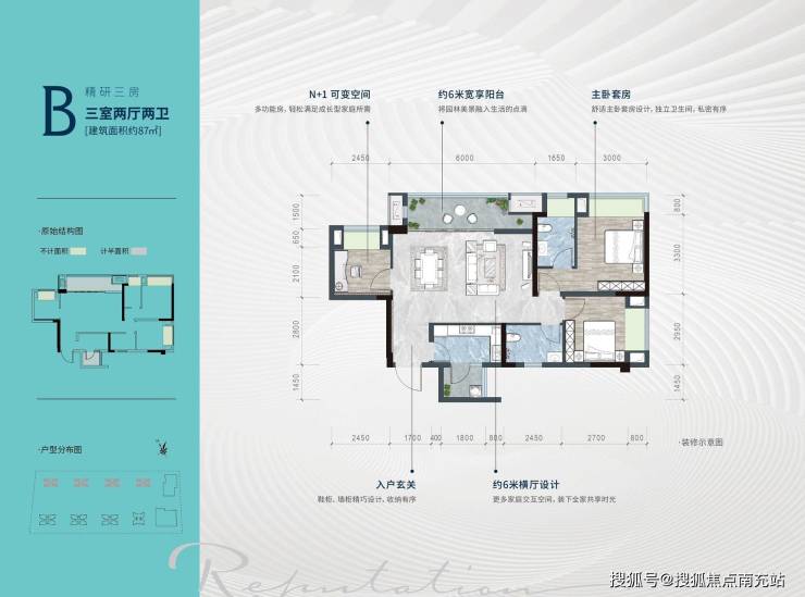 建面87,套内70,横厅,南北向(三房二厅二卫)实得83左右