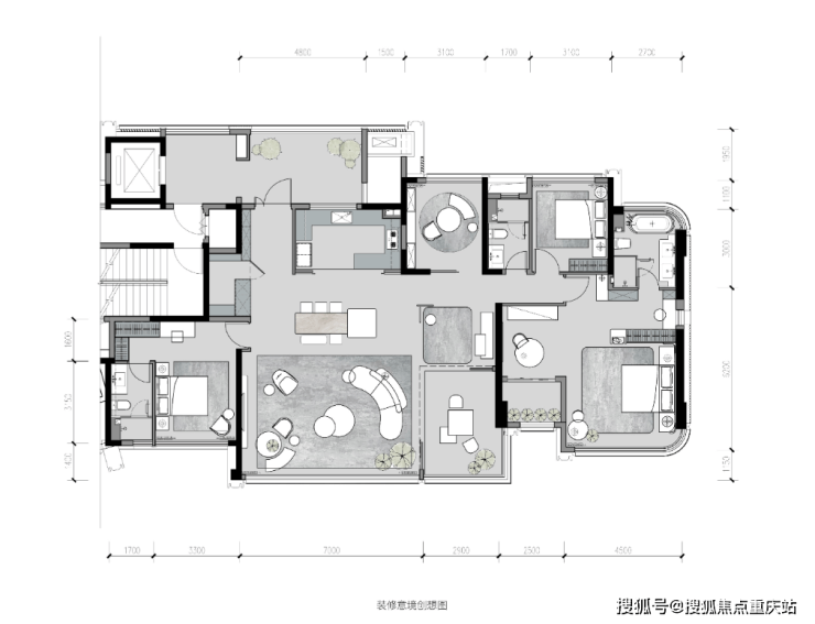 最出彩的还是主卧设计,除了基础的起居室、衣帽间和四分离主卫,主卧套房带一个休息区,外连景观阳台。整个套房尺寸近50㎡。
