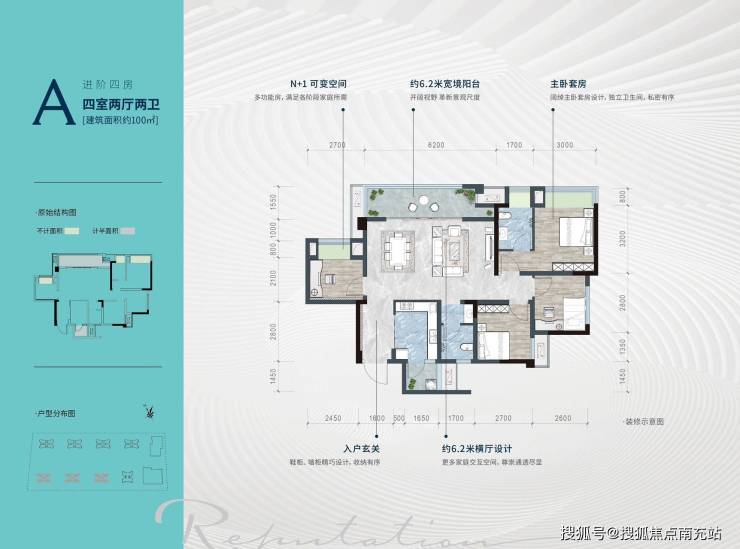 建面100,套内83,横厅,南北向(四房二厅二卫),实得90左右