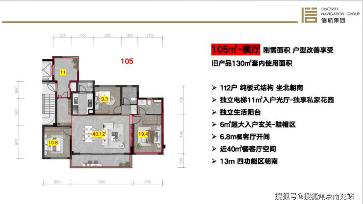 项目以现代艺术风格为设计理念,巧妙运用超现代艺术的弧形线条,搭配流线型的公建化外立面。同时,结合高低错落的建筑形态,构建出多层次的天际线,致力于打造区域内的“地标性建筑”。户型方面:有一款105m²套三双卫户型备受关注。该户型采用横厅设计,属于大三房格局。其得房率高达 107%,套内实得面积约 113m²。这一面积表现,在市场上可与其他产品套内实得面积约 130m²的户型相媲美 。