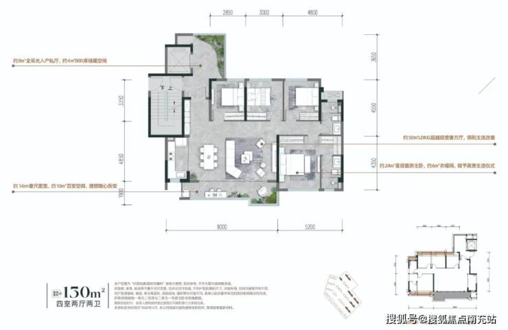 超50㎡的LDKB一体设计方厅,气度轩昂,外连面宽9米的L形阳台,轻盈灵动,可按照业主需求,任意打造。