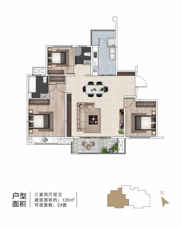 在售面积:125平,套三双卫