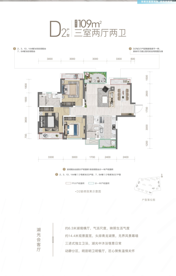 D系列:套三双卫户型(108/109㎡)一个为横厅,一个为竖厅