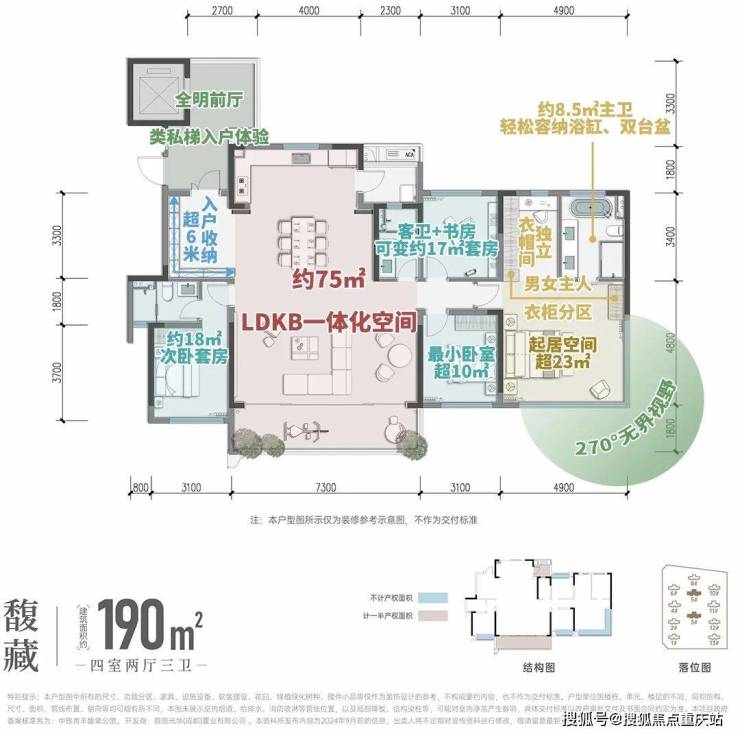譬如超4米的玄关柜+换鞋区配置,让家庭收纳毫无压力;南向五开间、三卧室朝南,形成超17米南向采光;“三阳台”设计(全明电梯前厅+生活阳台+景观阳台),同时景观阳台连续采光面超8米,阳光中打理花草、月色中小酌一杯,度假何须出门?横厅+景观阳台面积超42㎡,亦为家庭互动带来无限可能性。
