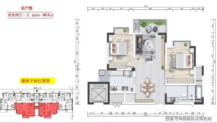1栋(1梯6户)总层高11层,面积段54m²、89m²、91m²