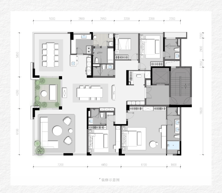 蜀曜290㎡:一层两户,这个户型的餐厅和客厅都置于端户的最佳位置,有270度观景面,花园位于餐客厅之间,连起来最大采光面有16米多。玄关处有特别设计的储物空间,原本的走廊因为宽绰,可以设计为第二客厅或者亲子学习娱乐交流区。餐厅、客厅、第二客厅抬头都可见花园,如果有一园鲜花或是绿植,既可以沉浸其中也可以多角度观赏。