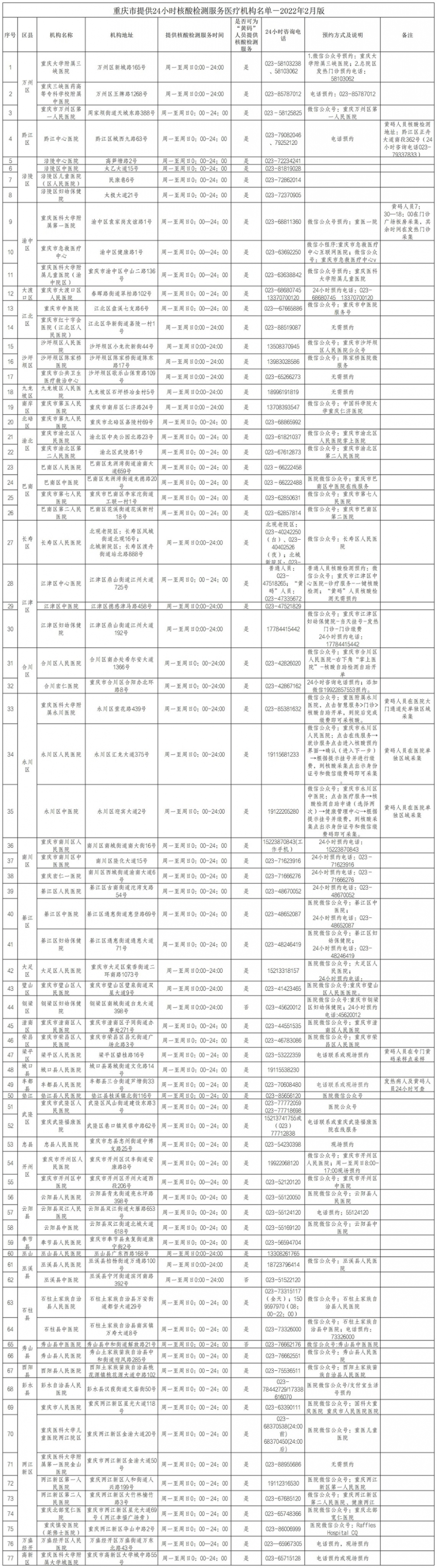 此前,重庆市卫健委公布“重庆市提供24小时核酸检测服务医疗机构名单(2022年2月版)”,以及“重庆市提供核酸检测服务医疗机构名单(2022年2月版)”。详情如下。