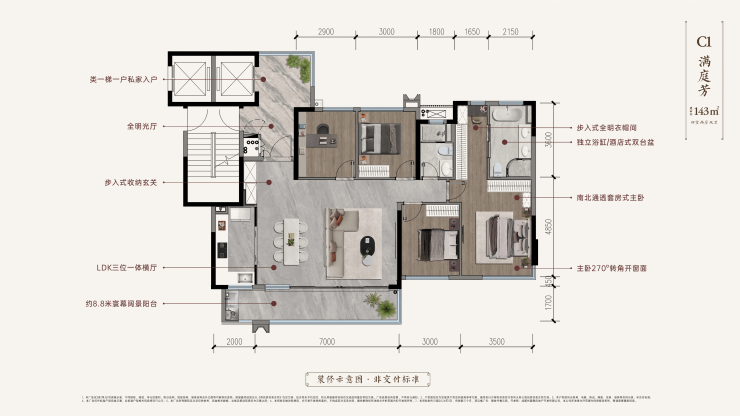 项目共有5个户型,包括128、130、143、188、191㎡。所有户型都是光厅入户、大面宽,且得房率高达91-94%。项目本批次推出的是130和143㎡户型。