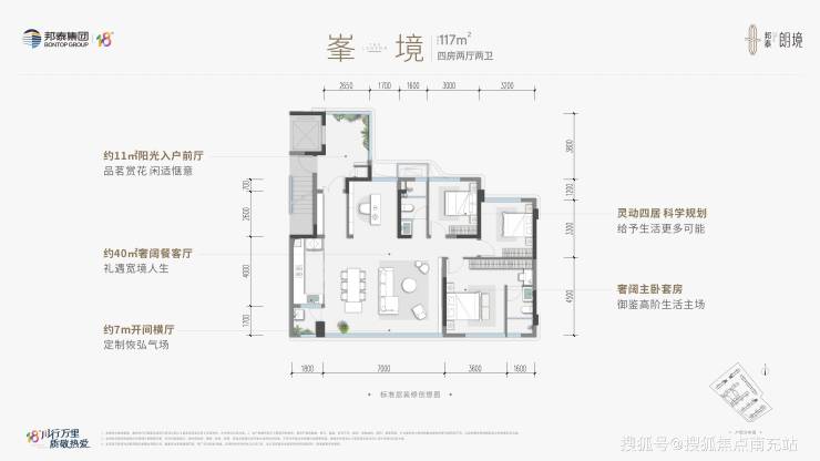 建面约135㎡ 樾境 四室两厅三卫+双套房(精装)光幕美学立面,酒店式套房主卧,双套房设计,中央社交方厅