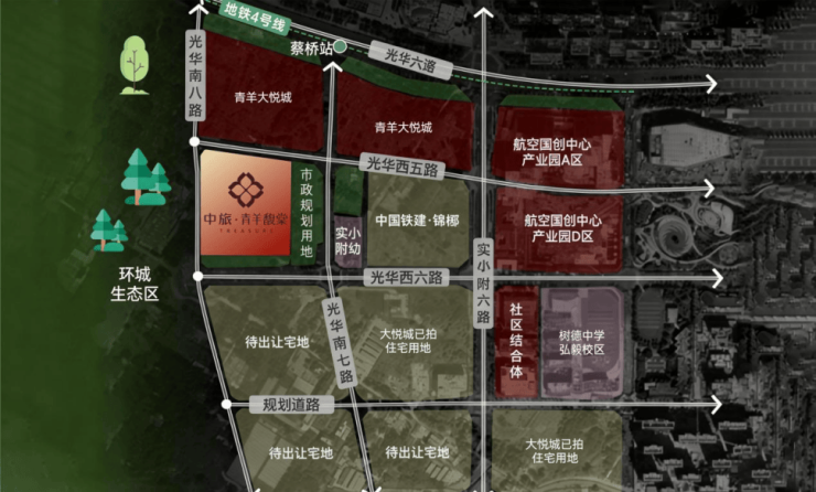 不仅如此,蔡桥之于青羊,其战略地位,犹如林家坝之于锦江,作为“青羊主城最后可成片开发的珍贵土地”,目前尚有200亩住宅地块未开发,且预计未来住宅用地容积率普遍在1.5-2.0,打造全城西稀缺的成片低密住区,也是大悦城旁的高端居住封面。