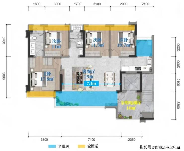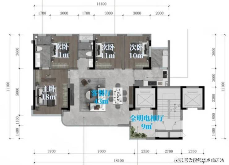 这个项目还有一个113㎡四房双卫的全景舱户型,说是全景舱稍微牵强一点,但是有点类似哈。