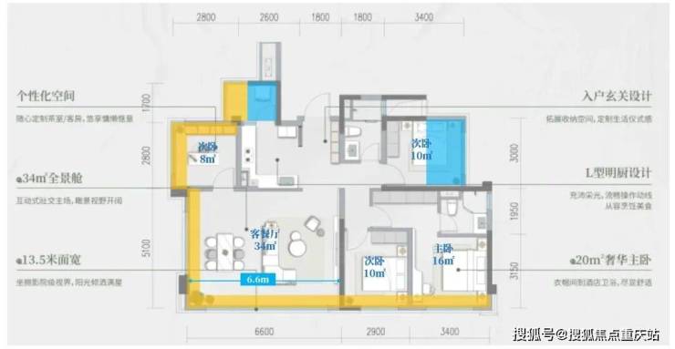 →这个项目户型设计区别于常规项目,客厅6.6米开间,且是双面采光的端厅,光这一点已经超越同面积很多户型了吧;
