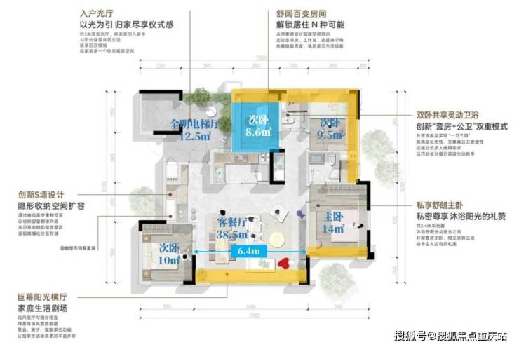 →这个面积段的方厅户型比较少见,6.4米开间的方厅,餐客厅面积达到38.5㎡;