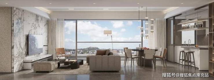 餐客厅一体化设计,与9.5米大尺寸景观阳台无缝对接,空间感和视觉效果增强。