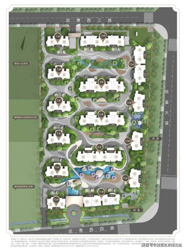 西璟天玺项目共计规划有15栋住宅,均为10-11F全小高层的设计,大部分为南北朝向,小部分为东西朝向。