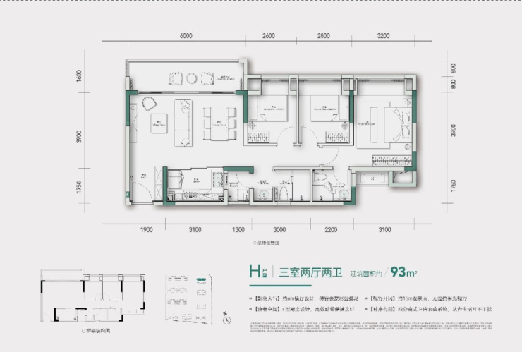 建面93平方米 三房双卫