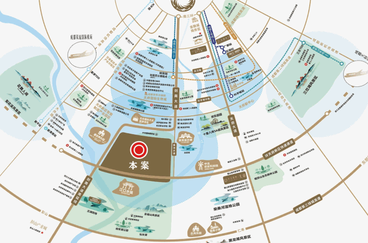 “水陆空”三维立体交通网络,四通八达:占据城南发展主轴,无缝衔接天府主城,环天府新区快速通道横向接驳剑南大道,天府大道等8条城市主干道。双流机场、天府国际机场,双机场加持,同频国际发展;千年黄龙溪码头,“两江一湖”水上互联网重要节点