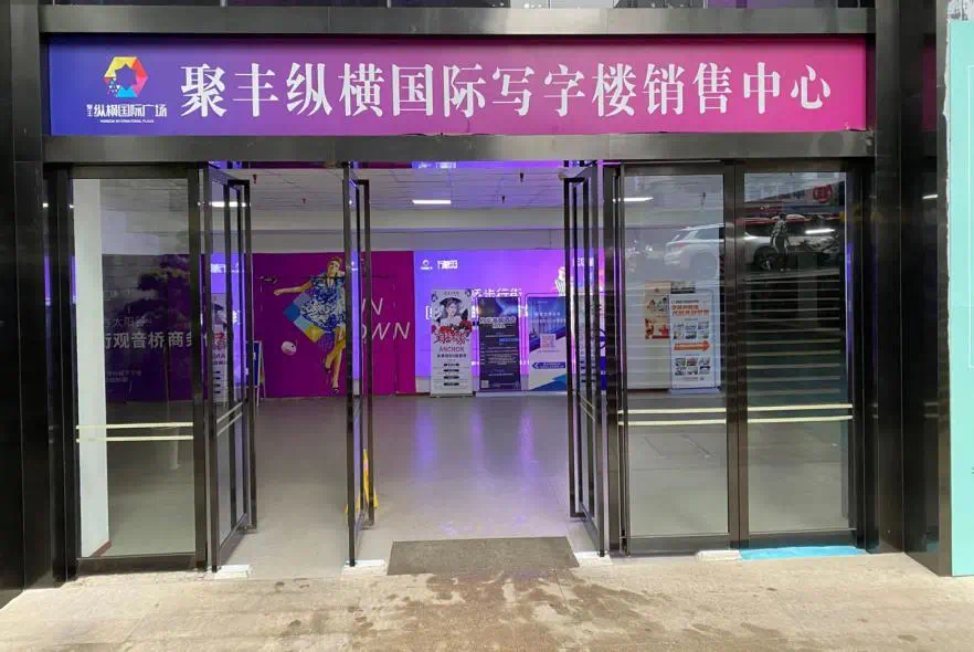 大门处显示,聚丰纵横国际广场的写字楼还在销售中,招牌看上去比较新,应该是近期才换的。