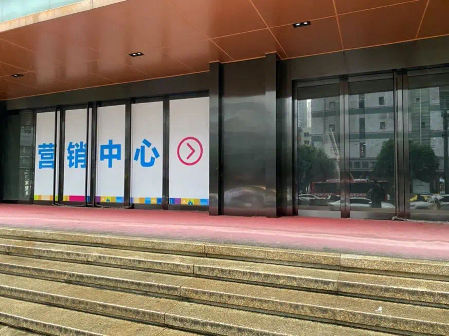 出来之后,我从街边布满青苔的阶梯上去,来到了位于二层的营销中心,此时大门已经关闭,人去楼空。