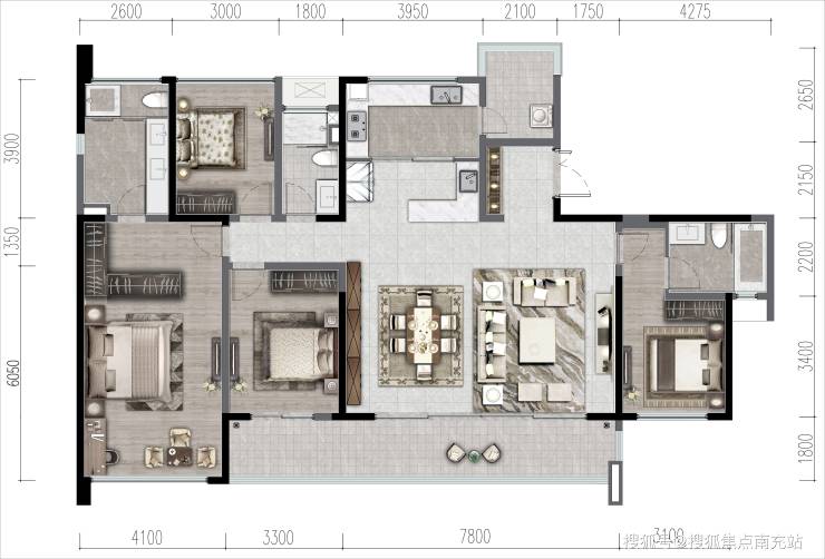 C户型 建面约142㎡ 四室两厅两卫(西北朝向)