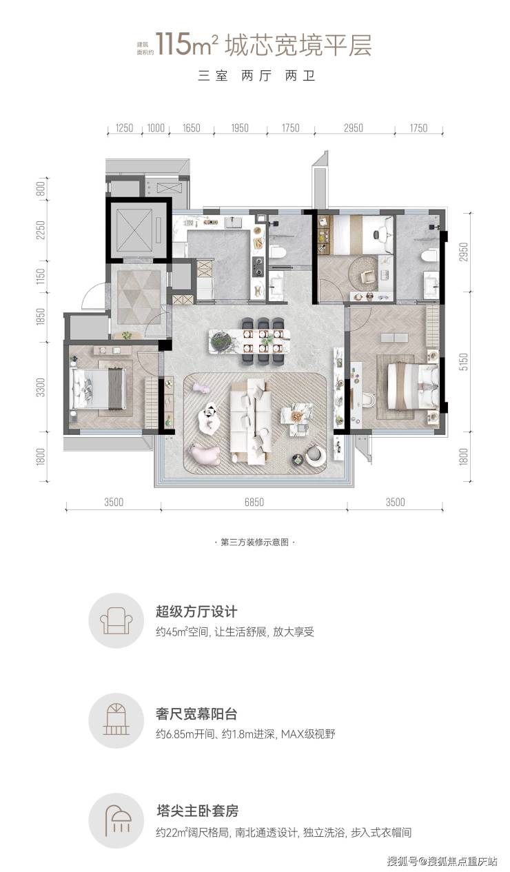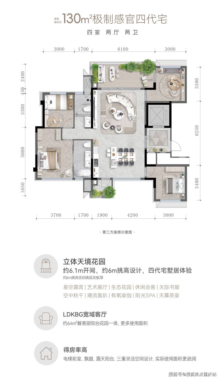 重庆难得纯粹住区,由春风四季艺术馆(归家动线)、高感泛会所(8/9/10号楼中庭中轴)、新加坡式度假景观构成,建面约115-143㎡极制感官四代宅,迭代首发。