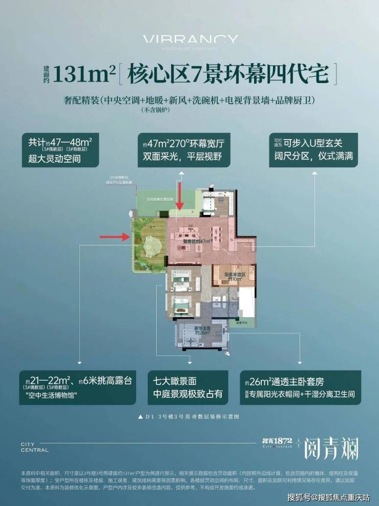 建面约131㎡奇数层户型拥有约17.4米超大面宽,而且7大瞰景面均为中庭朝向,极致享受小区超大中庭地景观视野。同时,该户型还拥有面积约47㎡的270度环幕方厅,享受双面采光,进一步提升了居住体验。不愧为此次加推的央景王座的镇楼户型。