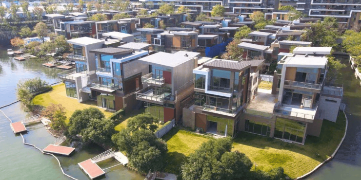 8.原溪岸:位于滨湖区亲水湖居,大隐于一城繁华中央。抬头可见蓝天白云,低头可见翠绿湖岸,现代湖岸太空舱风格独栋别墅,全新理念升级幻主,紧邻山林溪谷公园,湖景依然很棒。