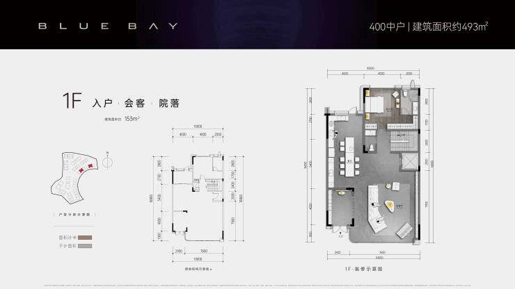 400户型约495㎡;总价约909万;赠送面积约67㎡;实得面积约562㎡;3+1结构,多功能布局,超高性价比,入驻蓝楹湾的最低门槛。