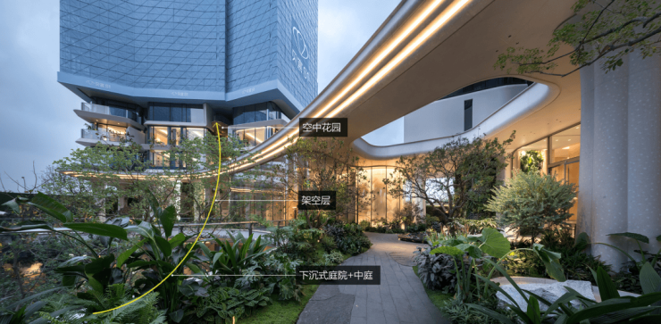 下沉式庭院→地面中庭→架空层→空中花园形成完整的生态,通过绿植将建筑向上生长。