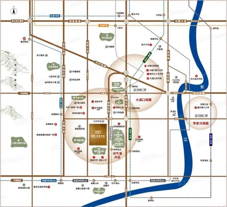 1. 四条轨道(2号线金家湾站,5号线华岩中心站,18号线金鳌山站,规划21号线距规划站点300米左右)