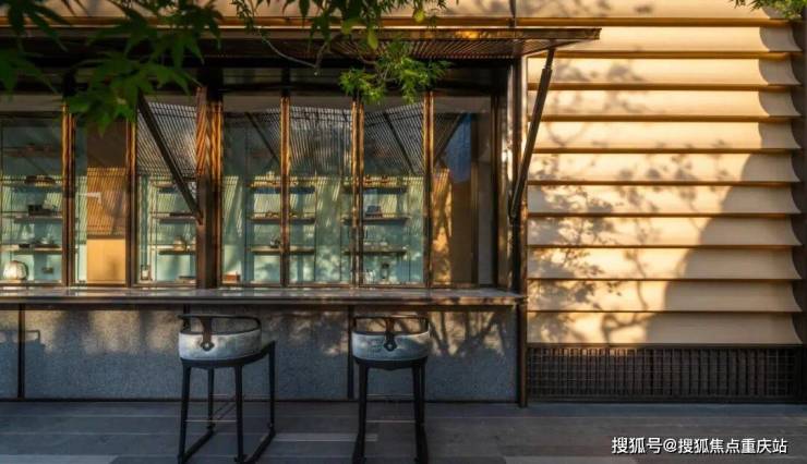 屋顶展翼飞檐、香槟色饰板、蓝灰色中空LOW-E玻璃,金属擗帘杆作为线条勾边,更是以建筑的方式,再现了天青汝窑镀金边的绝美风韵,屋身中段以“层层楼阁”为灵感,通透轻巧,精致飘逸。