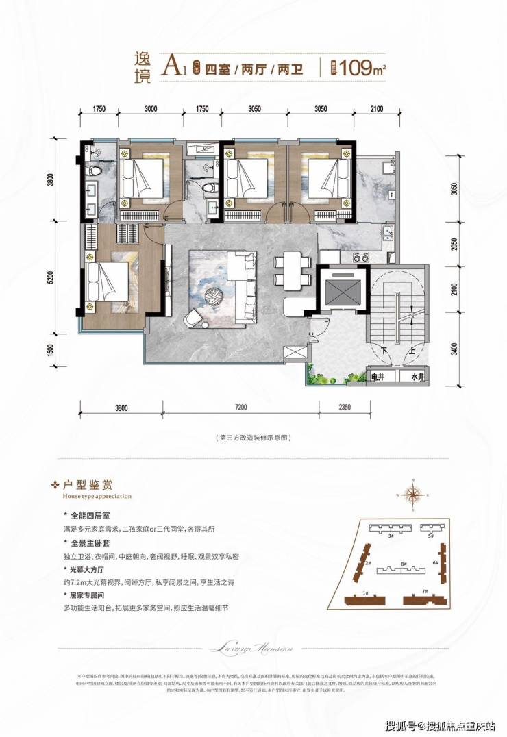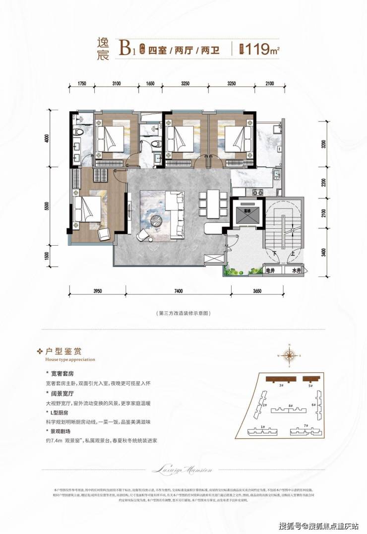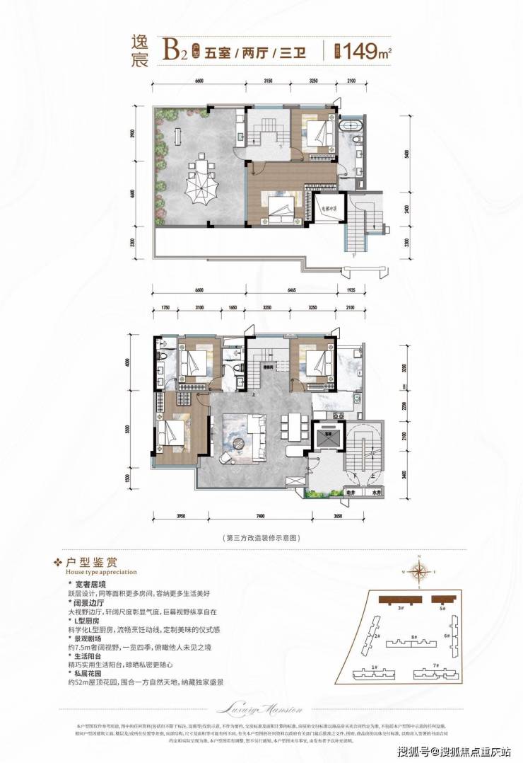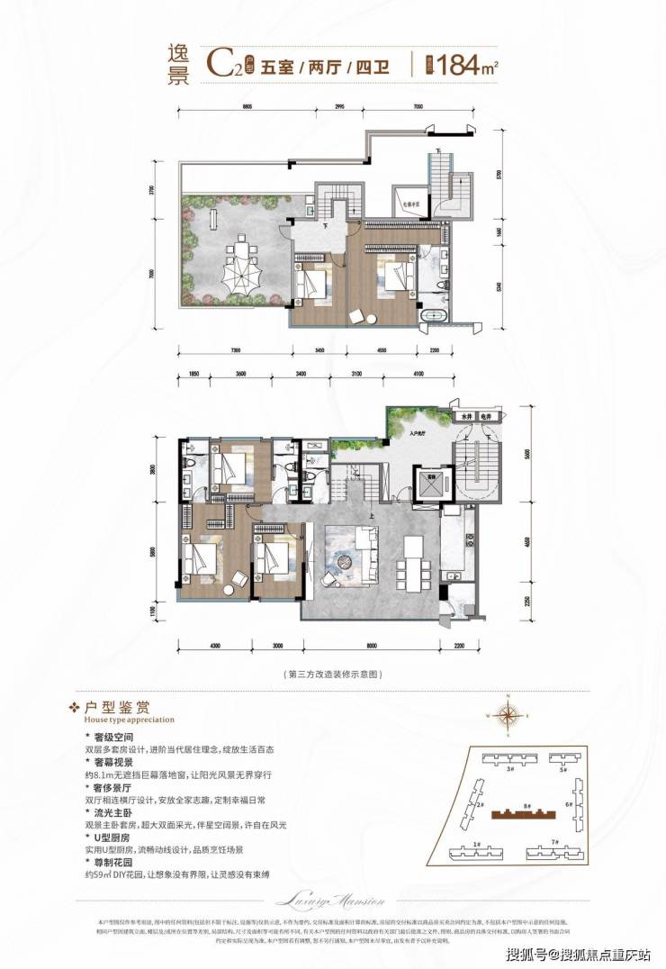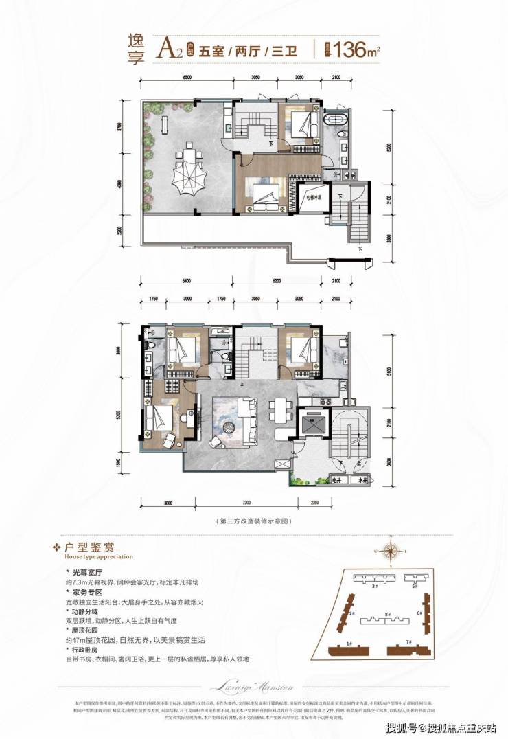 户型格局:上下双层立体空间,下层为公共活动区,上层为私密休息区,赠送约 30-50㎡超大星空露台。