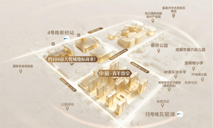 中旅·青羊馥棠,就站在这个“中芯”的正中央。作为距青羊大悦城最近的项目,坐拥三面绿地、百米双地铁的绝妙位置,步行动线即生活半径。在蔡桥大悦城板块,中旅·青羊馥棠不仅是性价比“最优解”,更是稀缺的准现房核芯资产,堪称“中芯的中芯”: