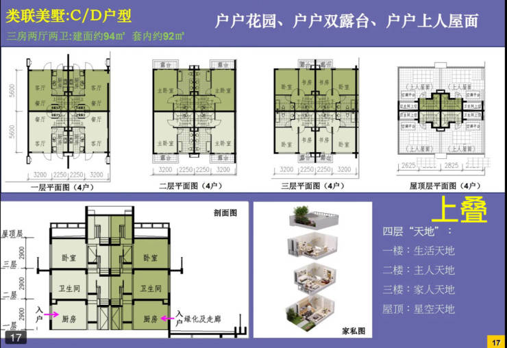 三房两厅两卫|一叠三层楼|户户门前入户花园10㎡ |单层面积约30㎡