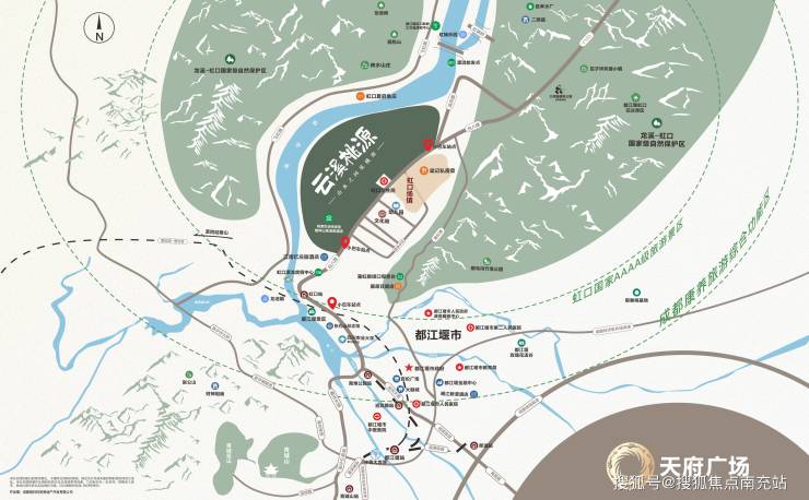 ▲周边商业:小镇商业街、小镇市集、社区电商、都江堰大融城、百伦广场。