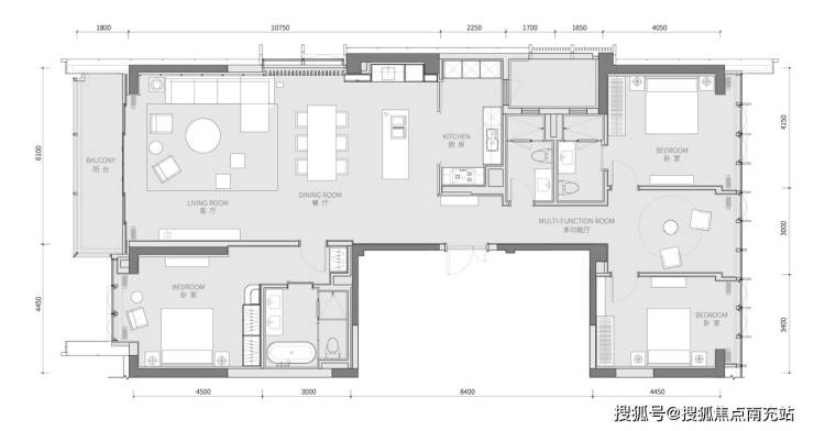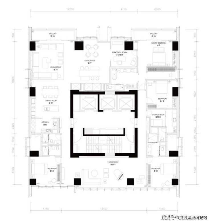 蓝庭项目占地约30亩,包含3栋住宅和1栋商业建筑。住宅部分高达35-44层,采用全幕墙公建化立面,赋予建筑轻盈纯粹、平衡统一的质感。3T2大平层设计,主推建面约250㎡的四房三卫户型,双套房设计,让居住者拥有更高的自由度和从容感。