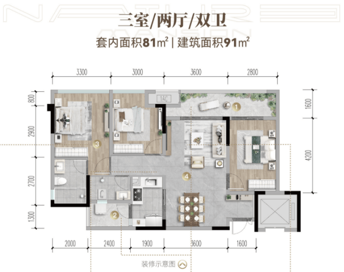 【A户型】建面约91㎡|套内81㎡,三室两厅双