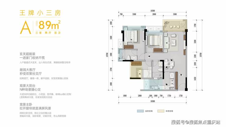 6、户型面积89~119㎡,以高得房率缔造极具性价比"超能打"的产品,赠送率可达116-123%左右,整体户型方正,产品多样,居室、客厅均为大面积采光,全明房间、阳光户型。让每一户高品质的住户都能享受高端住宅区中庭花园的生活。