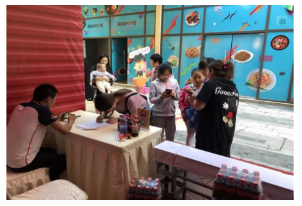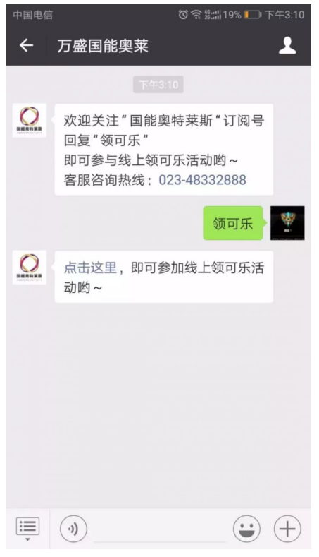 现场扫码关注“万盛国能奥莱”公众号就能免费领取1瓶可乐,分享到朋友圈并集赞就能免费领取5瓶可乐。